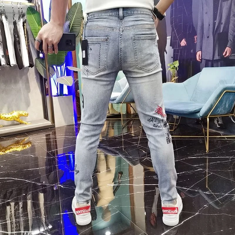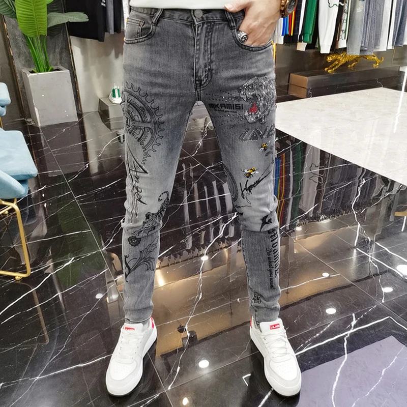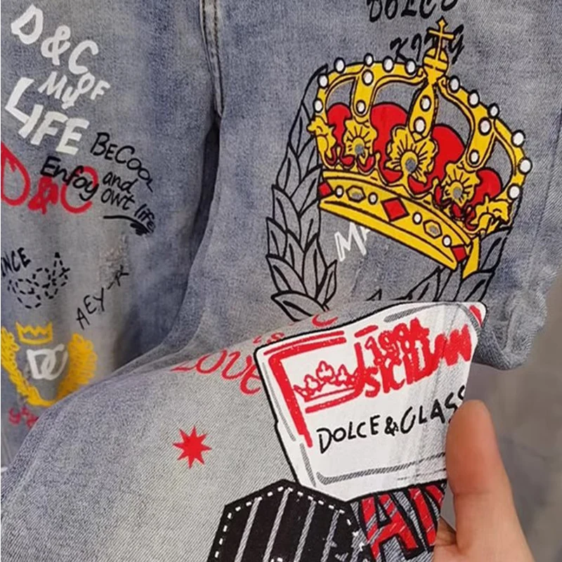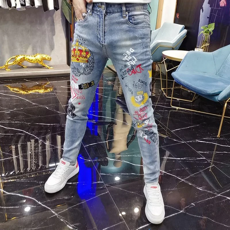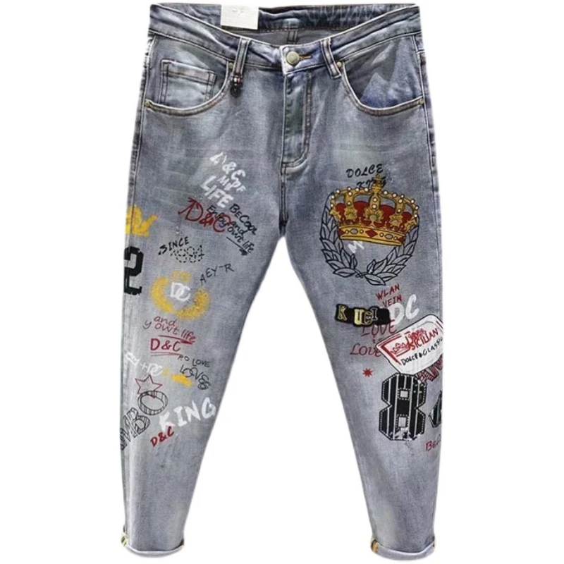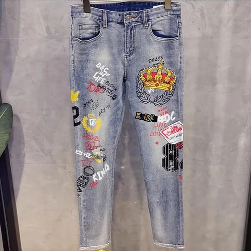 2024 New Graffiti Jeans Man Pants Spring Summer Crown Printe Jeans Streetwear Biker Skinny Zips Blue Cacual Long Denim Trousers